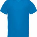 Breathable and quick drying, small V-neck, necktape, raglan sleeves with covered seams, double seams on sleeves and cuffs