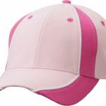 Lined sweatband made of satin, laminated front panels, 6 embroidered ventilation holes in contrasting color, velcro fastener